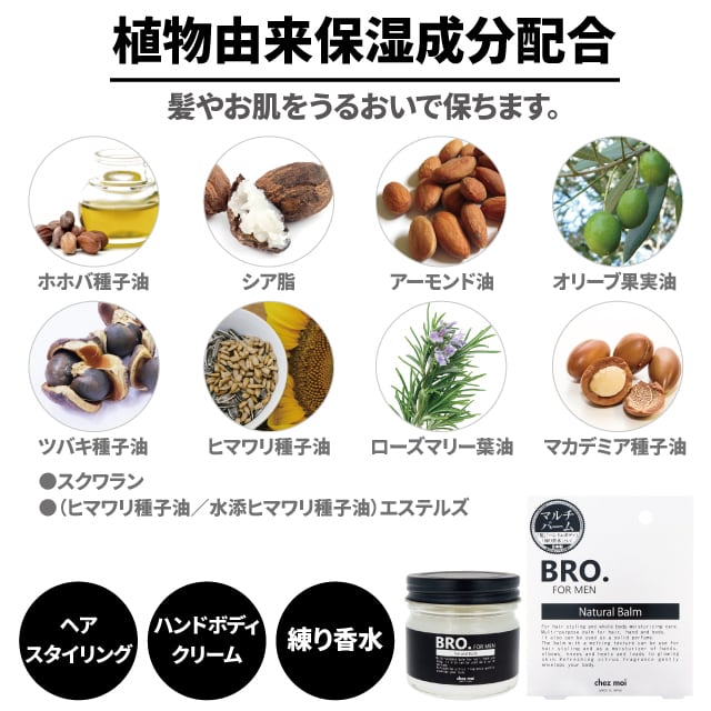 (ヒマワリ種子油/水添ヒマワリ種子油)エステルズ、ヒマワリ種子油、ミツロウ、オリーブ果実油、ホホバ種子油、香料、シア脂、スクワラン、アーモンド油、マカデミア種子油、ツバキ種子油、ローズマリー葉油、ヒアルロン酸Na、加水分解コラーゲン、酢酸トコフェロール、ダイマージリノール酸水添ヒマシ油、BG、水